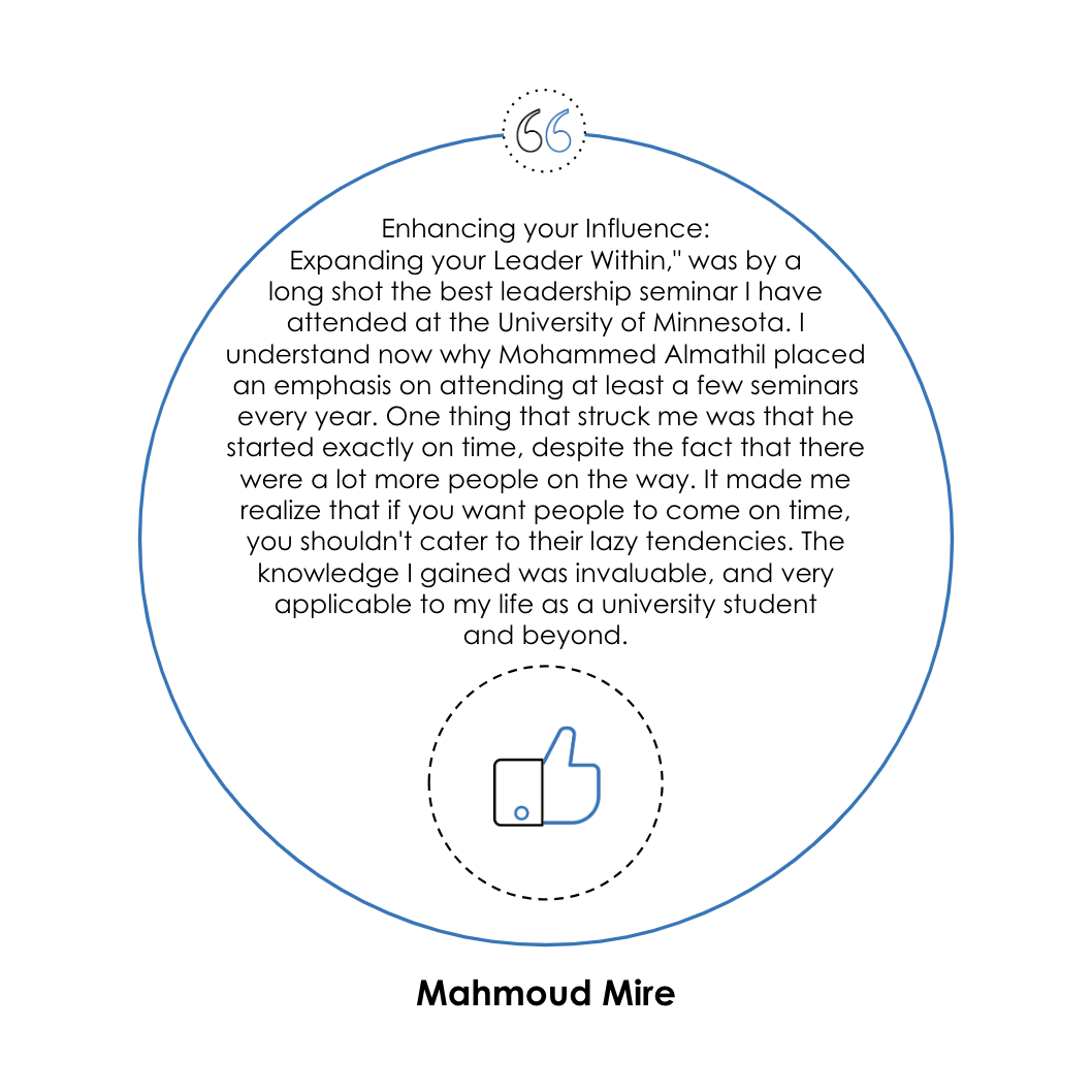 Since 2003, Almathil has served in leadership positions of various organizations. He is passionate about equipping leaders with best practices, skills, and attitudes necessary to grow themselves and their organizations. He has consulted, coached, and trained leaders, managers, and employees in over 300 organizations that are of different industries, sectors, and sizes. He has a track record of designing and delivering effective and impactful leadership development and change initiatives for Fortune 500 companies such as Microsoft, JP Morgan & Chase, Campbell’s, Fidelity investments, and more.